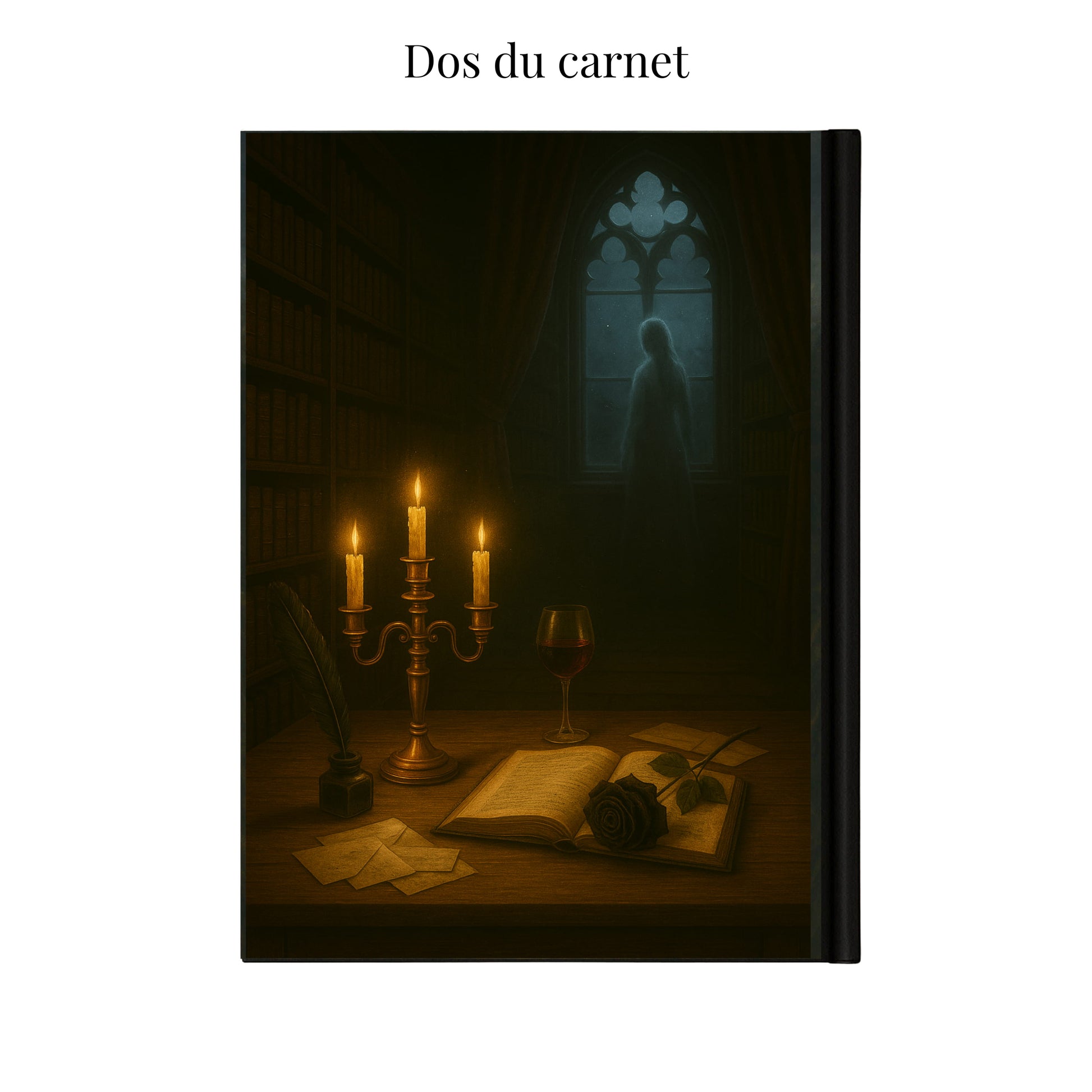Sur la couverture de La Bibliothèque des Ombres, une silhouette spectrale glisse devant une fenêtre gothique, tandis que les flammes vacillantes éclairent un bureau encombré de parchemins, d’un livre ancien et d’une rose noire. Chaque détail vous plonge immédiatement dans une ambiance entre mystère, histoire interdite et poésie nocturne.